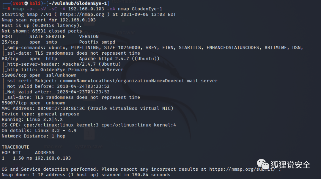 nmap -p- -sV -sC -A 192.168.0.103 -oA nmap_GlodenEye-1扫描结果显示目标开放了25、80、55006和55007端口