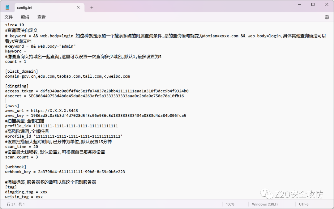 2.在config.ini中填入自己的各种key,包括某查的cookie,某fa的key,某图的key,钉钉的key(可以搞多个账号白嫖每天的500积分)