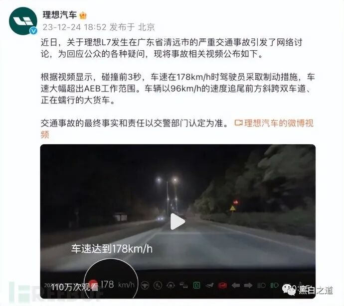 12月21日,一辆理想L7汽车追尾一台低速蠕行并跨越车道的大货车,造成2人死亡、1人受伤。24日晚,理想汽车官方公布事故视频称,碰撞前3秒,车辆在时速178公里时驾驶员采取制动措施,车辆以96公里的时速追尾大货车。理想汽车还公布了事发时的相关视频。因此,目前该交通事故的原因是“车辆超速”。