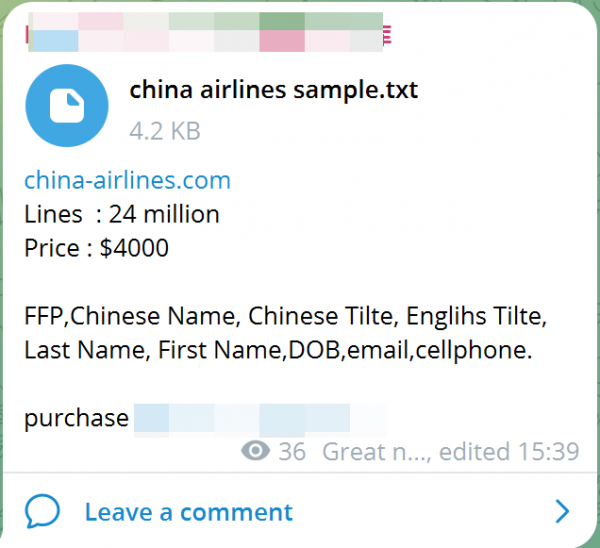 12月27日,一黑客在Telegram上发布了一项数据交易,其中包括中华航空(china-airlines.com)的信息来源。这次数据泄露涵盖了敏感信息,包括中英文姓名、出生日期、电子邮箱、手机号码以及飞行常旅客计划(Frequent Flyer Program)等个人数据。根据发布者提供的数据样本,这项数据交易包括了50条详细信息,而总共的数据数量高达2400万条,其售价为4000美元。