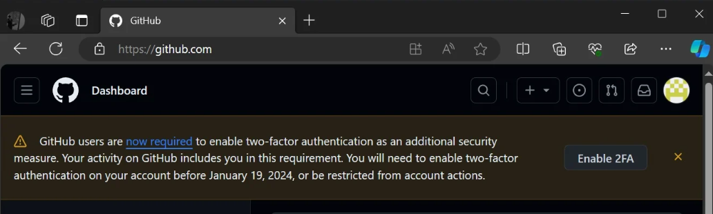 12月24日,GitHub向用户发送邮件通知称,所有向GitHub.com贡献代码的用户应在UTC时间2024年1月19日之前启用双因子认证。如果用户不启用双因子认证,其账户功能会受限,用户在登录GitHub后,也会有类似的提醒信息。