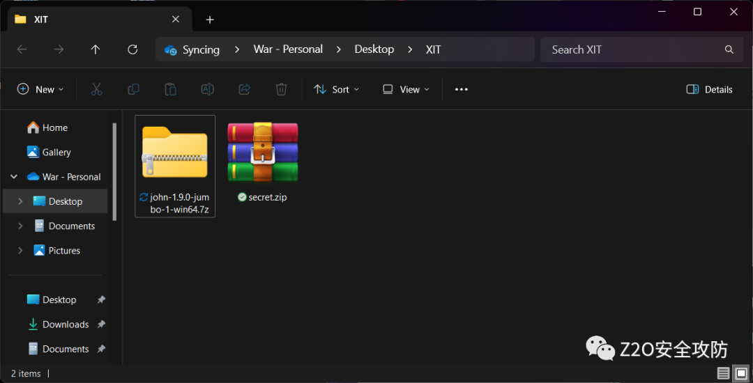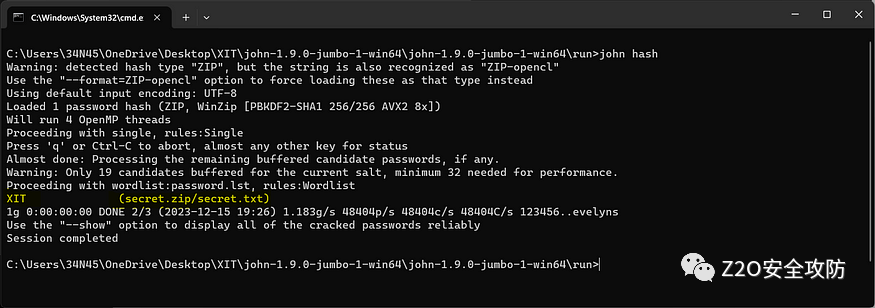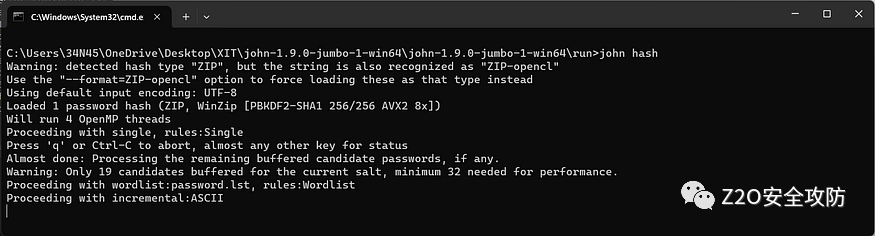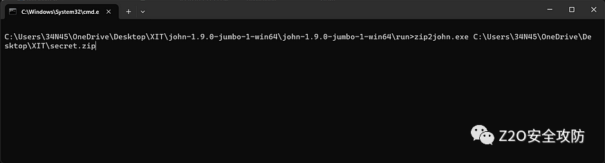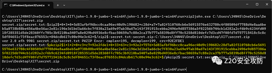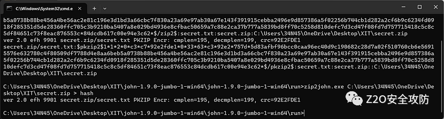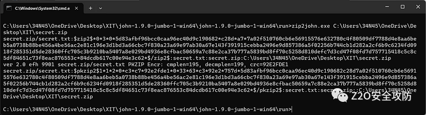 zip2john.exe target.zip我们可以看到文件哈希,我们将使用它来破解目标文件的密码。