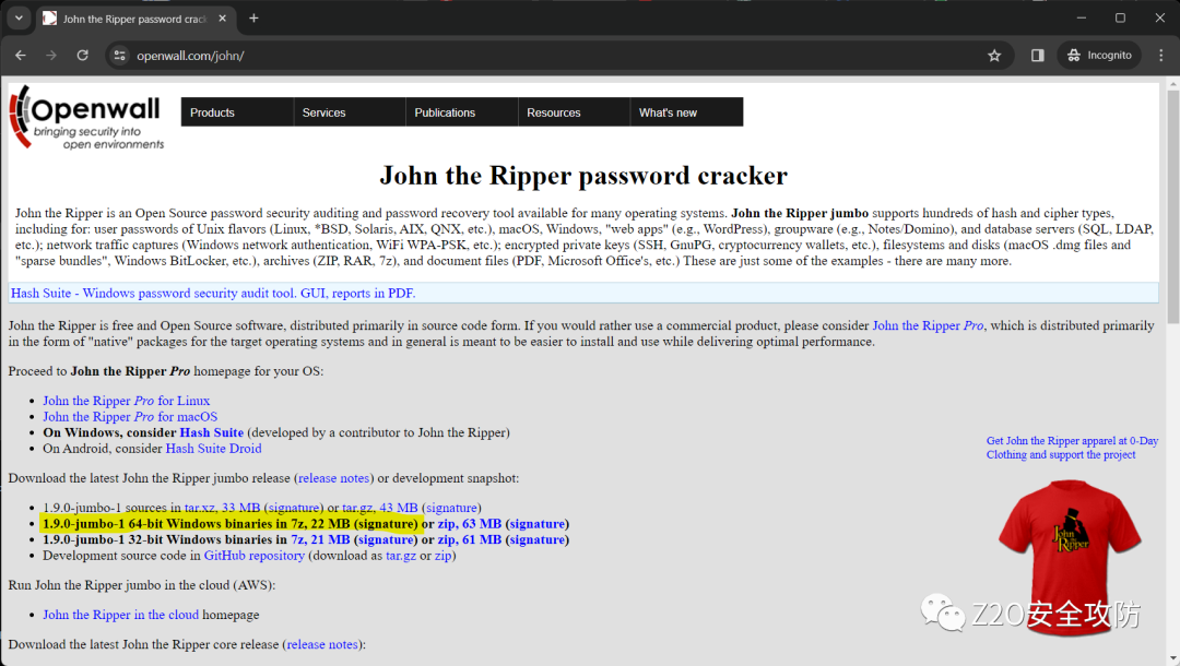 1. 导航到https://www.openwall.com/john/。由于我在64位Windows机器上,我将安装“jumbo-1 64位Windows二进制文件”。
