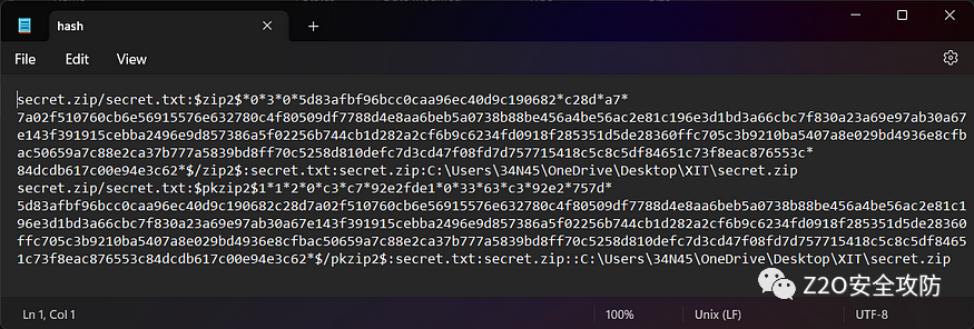 zip2john.exe target.zip > hash现在,在记事本中打开哈希文件。
