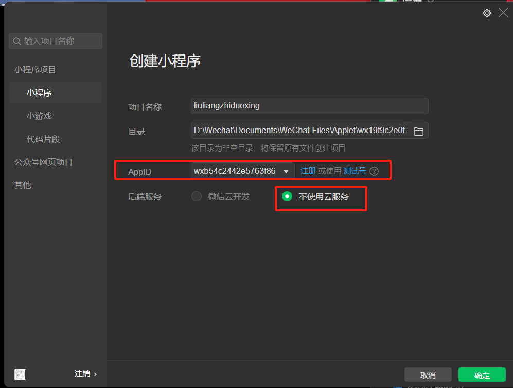 导入时候,选择不使用云服务, AppID 可点击测试号,自动获取。