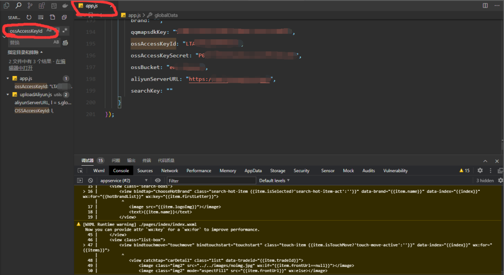 反编译源码,导入微信开发者工具后,在全局搜索匹配关键字,找到OSS信息泄露