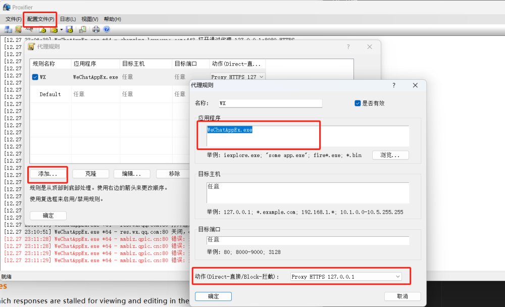 点击配置文件 -> 代理规则 -> 添加 -> 在应用程序中填写小程序的进程 WeChatAppEx.exe ,设置如下: