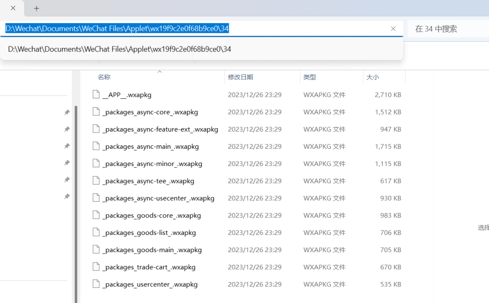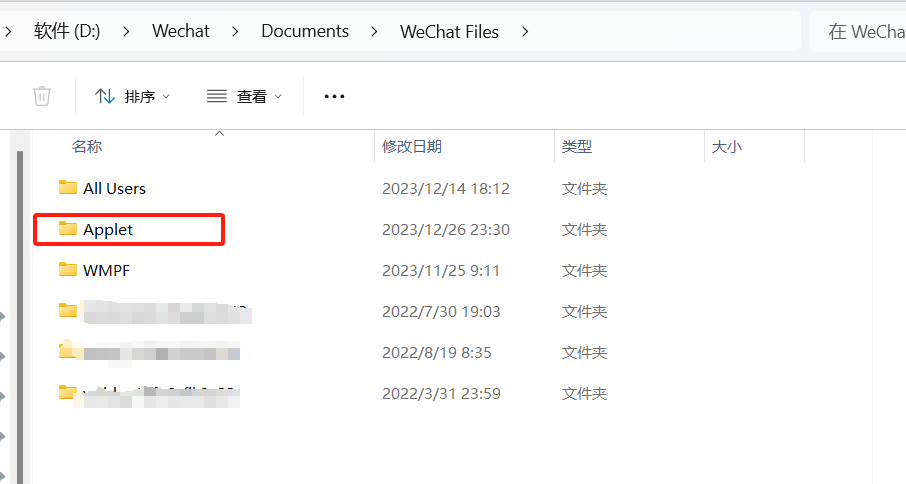 然后进入其上一级目录,WeChat Files目录,找到Applet目录