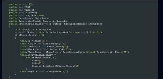 这个版本中的其他变化是将PackageType配置重命名为RDPconfig,将ConfigPackage重命名为RDPConfigPackage,表明攻击者专注于代理RDP连接。这些类的代码保持不变: