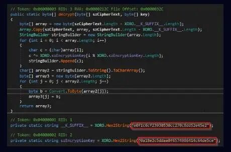 嵌入式加密模块的名称是XORO.dll,它的类是Encryption.XORO实现解密和加密方法的方式与基于Tunna的web shell相同,使用相同的硬编码值: