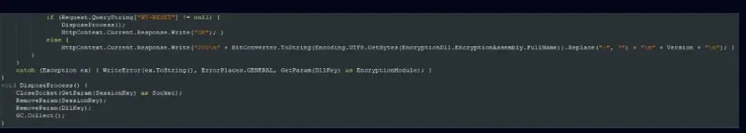 最后,代码中的另一个条件处理web shell接收非空参数WV-RESET的情况,该参数调用函数关闭代理套接字并向攻击者发送OK响应: