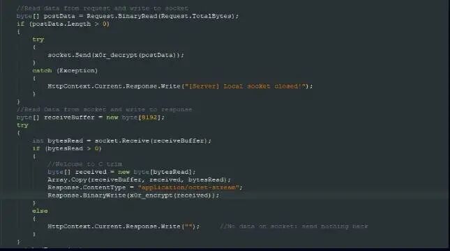 该攻击者使用的web shell的内部版本为Tunna v1.1g (Github上只有1.1a版本)。与开源版本相比,最重要的变化是通过使用预定义的字符串szEncryptionKey对数据进行异或处理并在末尾附加常量字符串K_SUFFIX来加密请求和响应: