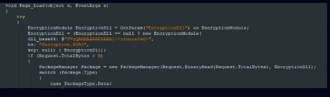 虽然这种简单的编码可以在web shell本身的代码中完成,但其他嵌入式dll的存在,如XORO.dll,以及在配置阶段提供另一个EncryptionDll的能力,意味着攻击者更喜欢控制他们在某些环境中默认使用的特定类型的加密。