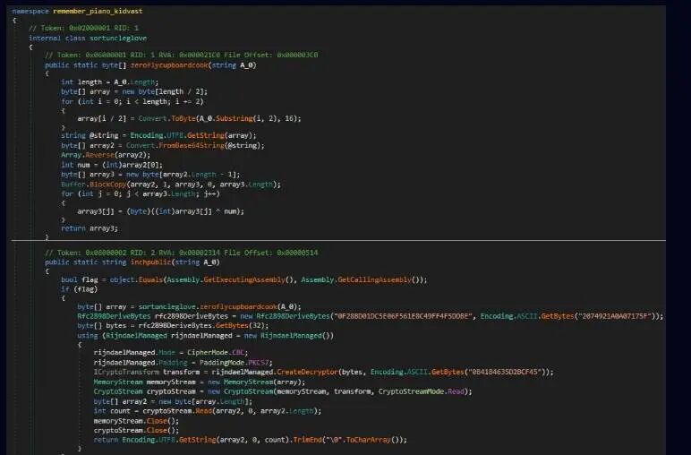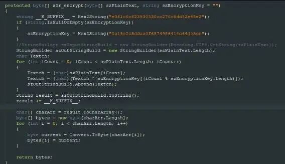 App_Web* DLL受到类和方法混淆的影响,所有字符串都使用Base64,第一个字节的异或和AES的组合加密如下:
