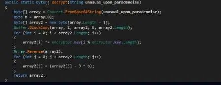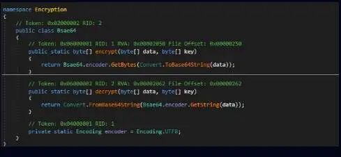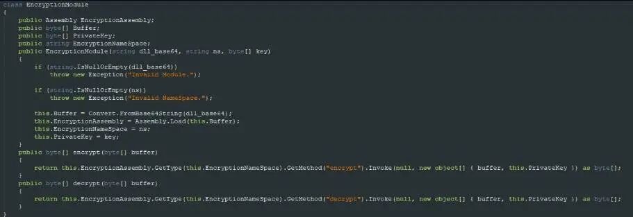 所有负责加密流量的功能都转移到一个单独的EncryptionModule类中。此类加载一个.NET DLL,该DLL嵌入FOXSHELL主体内的base64编码字符串中,并调用其加密和解密方法: