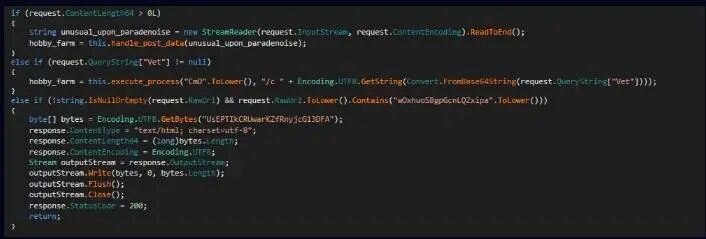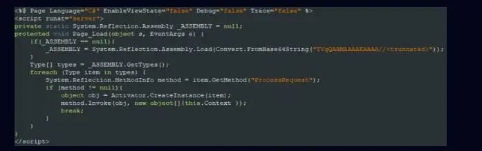 在发现的所有样本中,FOXHELL都被编译为DLL并嵌入到base64的基本web shell中。编译后的DLL将加载System.Reflection.Assembly.Load,则调用来自它的ProcessRequest方法。DLL是用.NET编写的,其名称模式为App_Web_