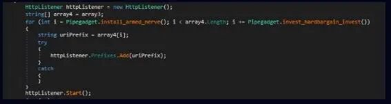 本文的恶意软件示例中配置的唯一相对URI是Temporary_Listen_Addresses。然后恶意软件使用HttpListener类开始侦听指定的URL前缀: