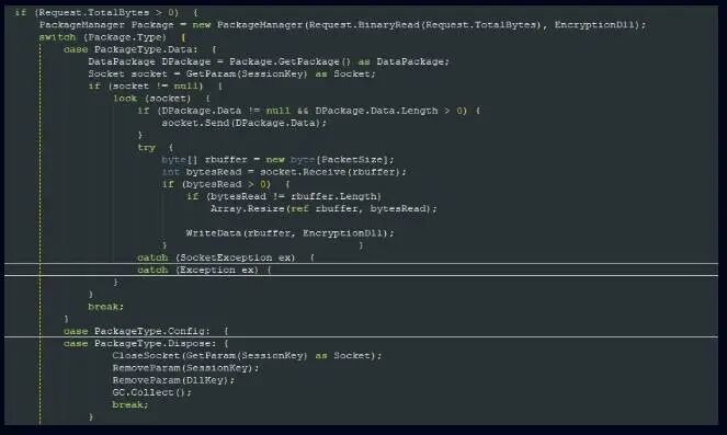 所有对web shell的请求也封装在一个名为Package的类中,该类处理不同的PackageTypes:Data、Config、OK、Dispose或Error。PackageType是由包的第一个字节定义的,根据包的类型,web shell解析包并应用配置(在配置中指定的远程计算机上打开一个新的套接字,如果提供的话,应用一个新的EncryptionDll),或者处理现有的套接字,或者如果包是Data类型代理连接: