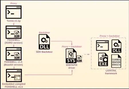 LIONTAIL框架组件与FOXSHELL、SDD后门和WINTAPIX驱动程序共享类似的混淆和字符串工件。目前,我们不知道有任何其他攻击者利用这些工具,我们根据多个代码重叠和共享的受害者特征将它们全部归因于Manticore。