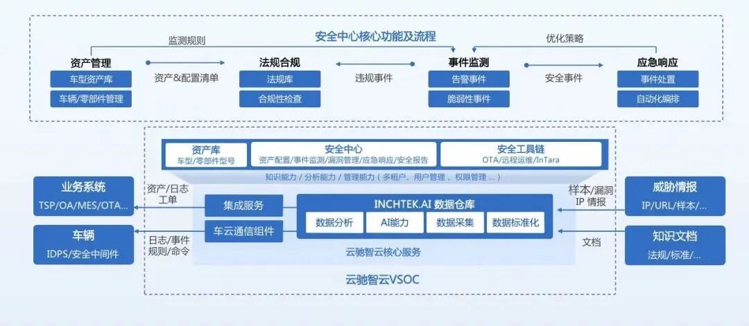 云驰智云安全运营中心VSOC通过为智能网联汽车提供采集、分析、预警、处置的运营框架,帮助客户持续应对网络攻击、威胁事件及漏洞。产品以合规为基础能力,提供开箱即用的监测规则及报表报告,帮助客户快速满足法规要求,支撑国内外审核认证工作开展。在此基础上,通过与InchTek安全工具链无缝衔接,赋能企业的威胁分析、需求管理、漏洞管理、应急处置,帮助车企守住安全底线,持续挖掘运营价值。