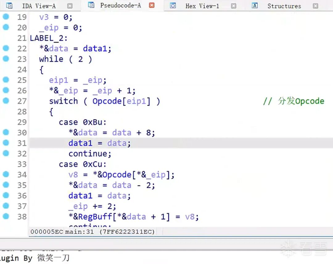 咱们应该可以理解当flag字符串正确的位数越多的时候,程序在运行时经过Opcode分发那一块的汇编指令的次数也越多,因此可以在Opcode分发的位置进行插桩,从而将程序判断的结果通过插桩的次数来展现出来,通过这种侧信道的方式来将程序的比较结果展现出来。
