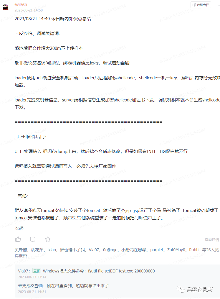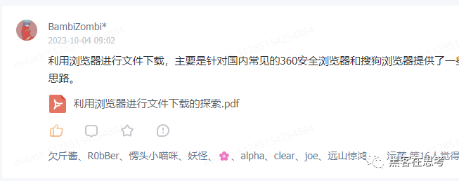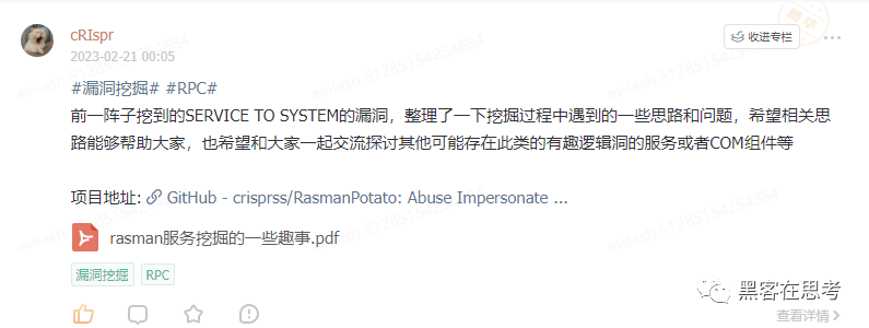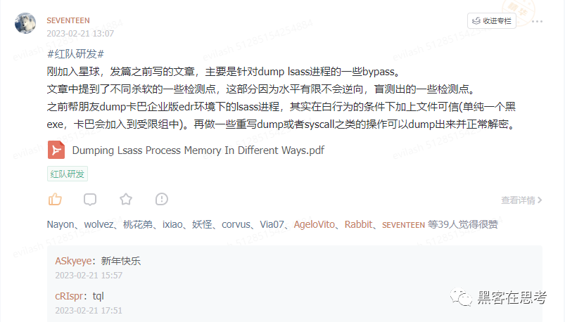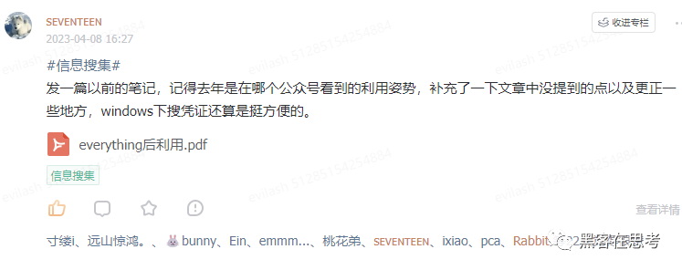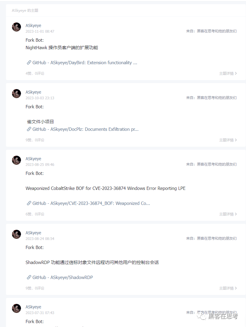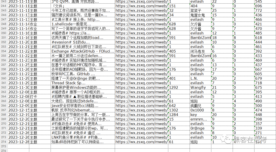 「黑客在思考和他的朋友们」 知识星球年终总结 知识星球今年共产生了270+条内容,感谢各位球友的输出,也欢迎新的朋友,老的朋友多多交流输出。下面总结一下今年黑客在思考和他的朋友们知识星球全年
