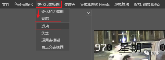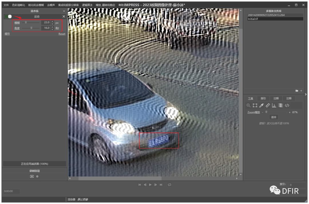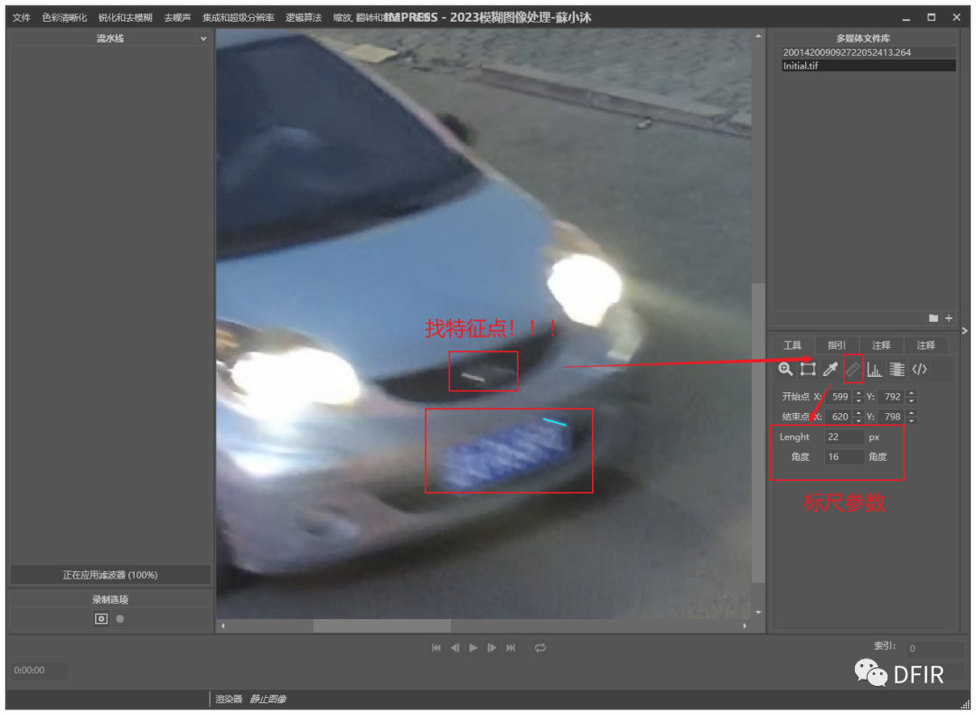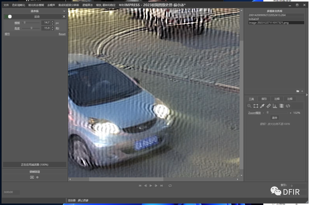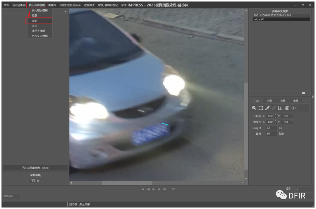 选择锐化和去模糊中的运动模糊滤波器。根据测量工具测量到的参数选择或使用角度参考线进行测量并得出"模糊角度和距离"填充至滤波器参数栏,滤波器自动运行并得出处理后结果。