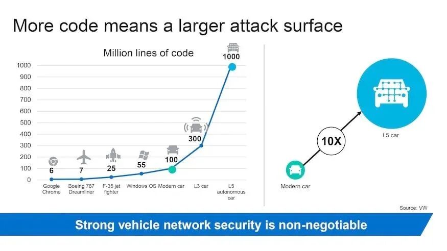 在经过优化以使用车载以太网的汽车中,所有内容都合并到一个网络上,通过单个受损组件进行系统范围访问的可能性更大。值得庆幸的是,保护也更大。