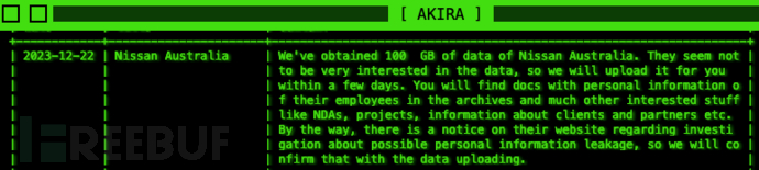 12 月 22 日,Akira 勒索软件团伙在其泄漏博客上添加了一个新的“受害者”,并表示其成员从日产汽车制造商的内部网络系统中窃取了约 100GB 的文件资料。值得一提的是,威胁攻击者还宣称鉴于日产汽车公司拒绝支付赎金,接下来会陆续把盗取的敏感业务和客户数据泄露到网上。勒索软件组织宣言如下: