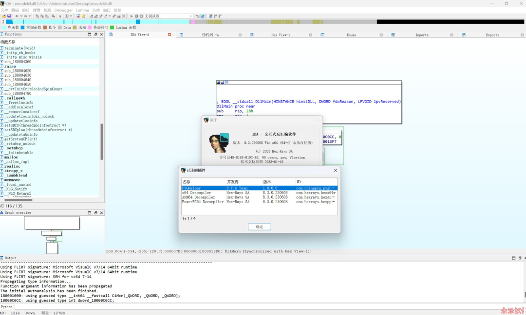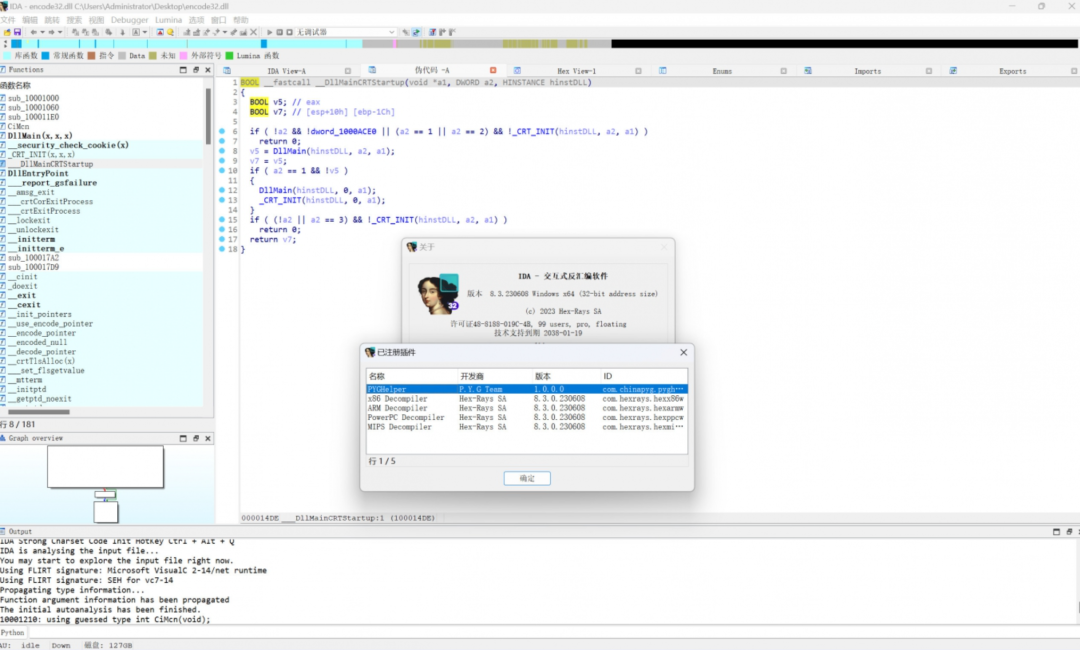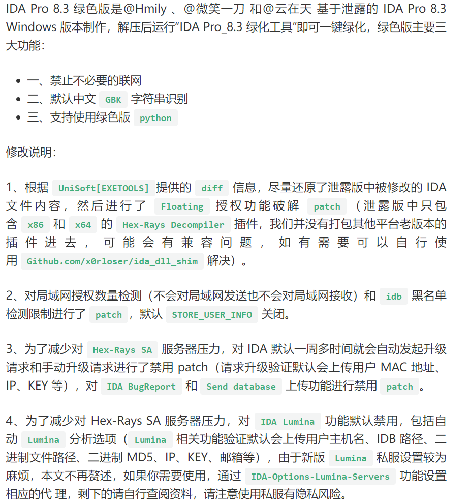 IDA PRO 8.3 是官方 2023 年 6 月 8 日发布,11 月 25 日泄露的绿色英语版,此版本 x32 和 x64 都支持 F5(x86/x64/ARM/ARM64/PPC/PPC64/MIPS) ,不可以升级,默认为英语版,仅支持 64 位系统使用。需要 8.3 汉化版需要赞助 300 才能领取。