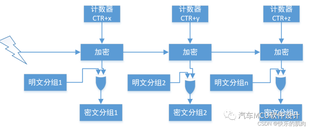 计数器模式使用与明文分组长度相同的计数器长度,计数器从某一初值开始,按某种算法递增,计数器值经过加密算法得到的结果再和明文进行异或,这样就可以得到当前明文组的密文。