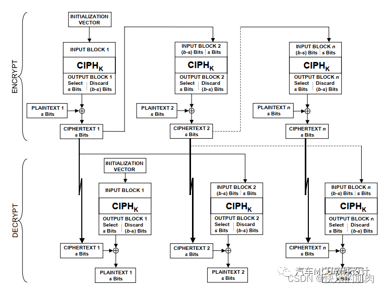 在该模式下,首先IV作为第一个block进行加密,生成第一个输出block;该block的s bit高位与明文的s bit高位作异或得到密文块,b(block size)-s不参与加密;b-s低位的数据 | 该密文块作为下一个block的输入。