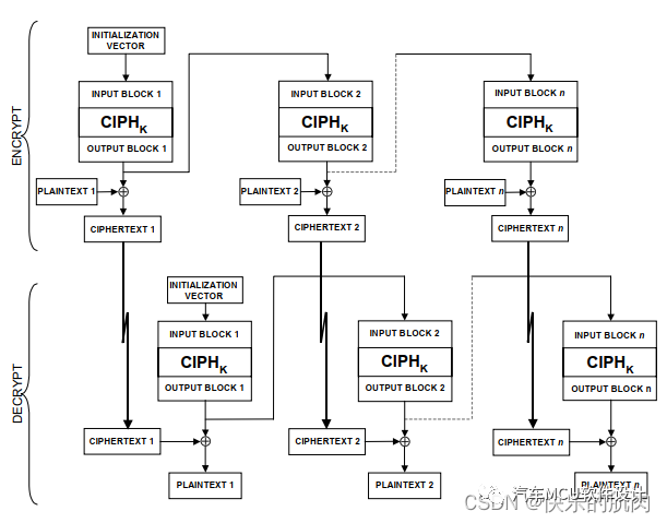 这种模式下,一个消息中的两个相同明文组会被加密成不同的密文,这样就避免了ECB出现的重复密文的问题。在最初加密时,需要使用初始向量(Initial Vector),这个IV需要发送方和接收方都知道,不用加密,但必须保证该IV的完整性。