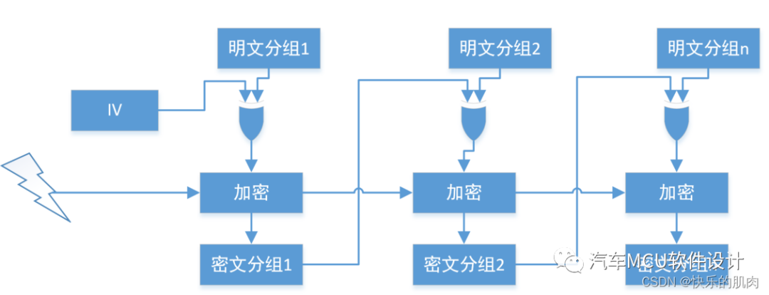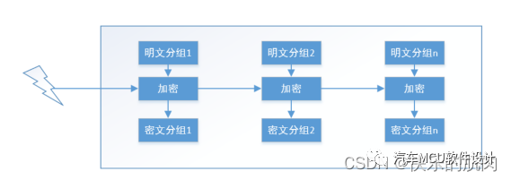 该种模式不能并行处理,因为当前明文需要和上一组密文进行异或处理。