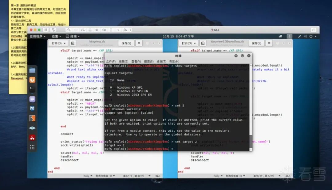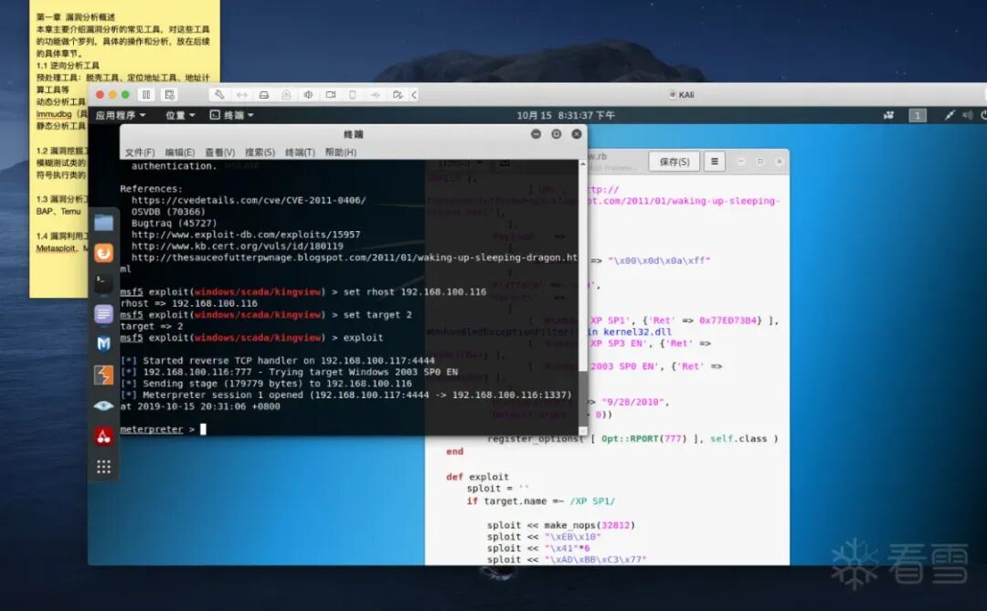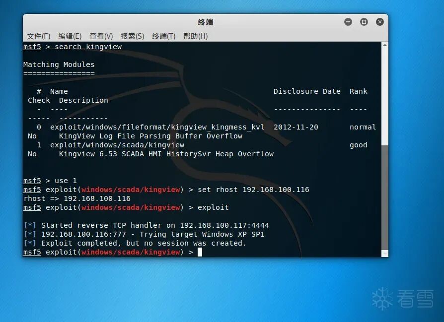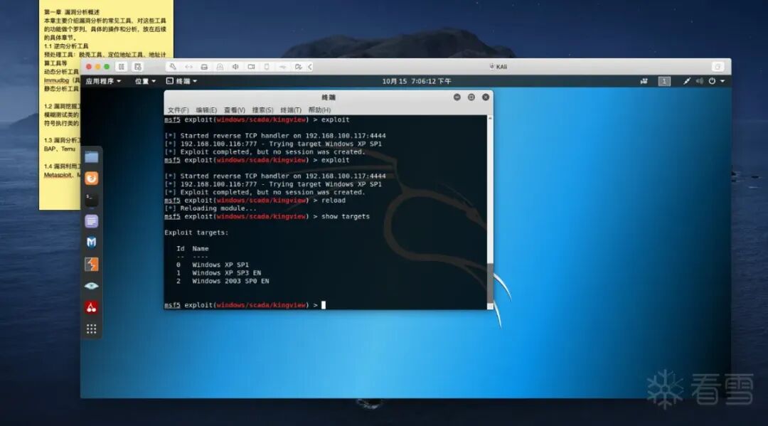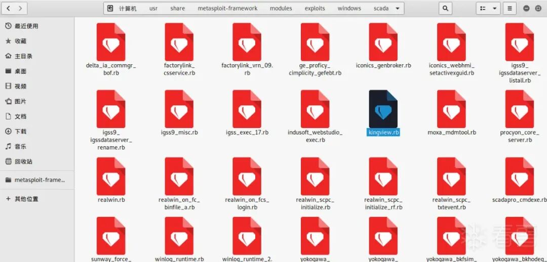 开启 Kali 安全测试主机作为攻击测试主机,确认msf框架 exploit 攻击代码录入并保存在/usr/share/metasploit-framework/modules/expolits/windows/scada 目录下。