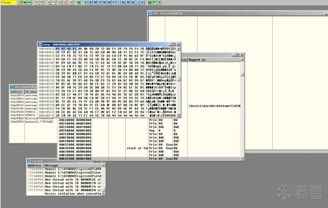 观察程序发生异常时执行代码为mov cl, byte ptr [eax + 5],即程序将执行该指针位置处的指令,然而该地址值为 0x00B5084D,并未获取到可执行指令。