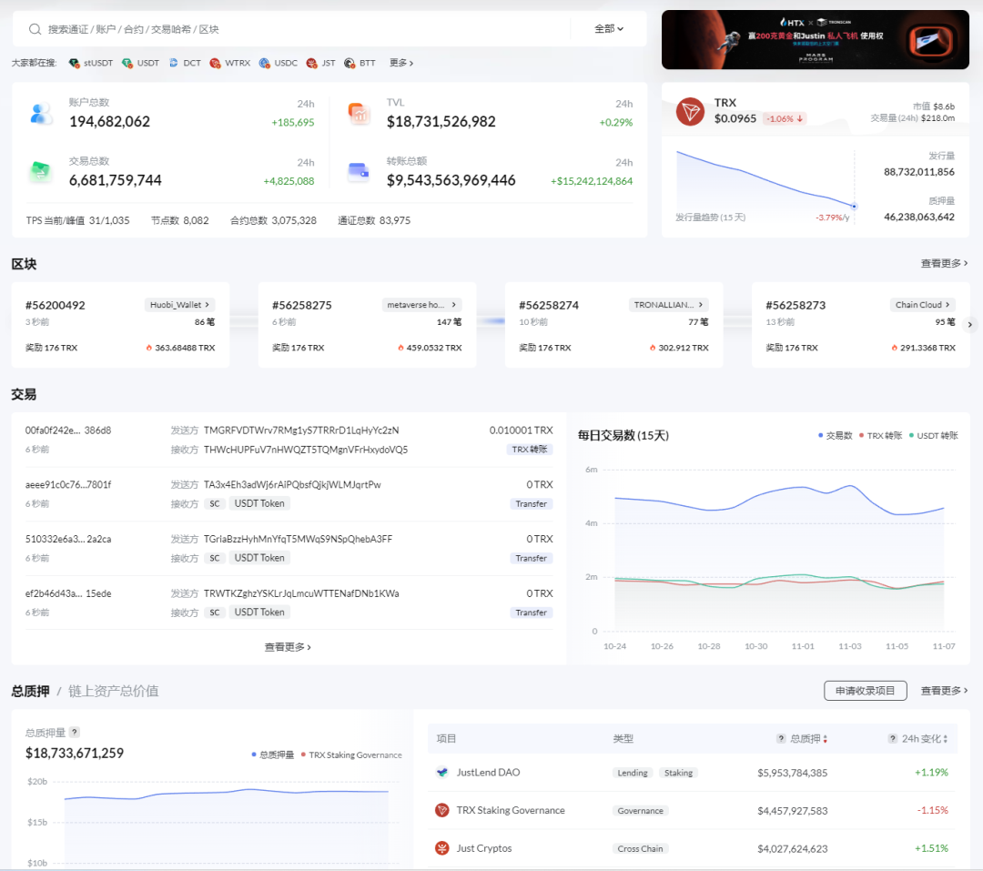 利用区块链浏览器我们可以看到实时的交易信息,它也会将以TRC标准发行的代币进行处理,减少我们对常用加密货币的发行合约的分析工作量,更快地获取我们所需要的数据,我们从最近交易中挑选一个账户进行查看: