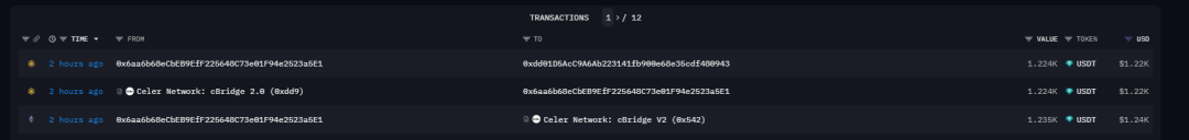 如上图所示,因为BSC和以太坊都是基于EVM,他们所使用的地址计算方式在私钥不变的情况下是一致的,所以通过聚合多条链的查询我们可以看到有一笔交易执行了 cBridge 的跨链桥合约,在 BSC 侧部署的 cBridge 合约发起合约调用,让cBridge合约调用USDT合约,对在BSC链上的目标账户进行了转入。