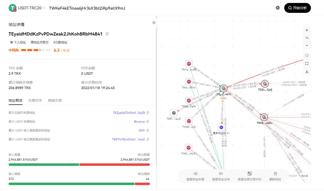 检索需要分析的地址,默认会把 Top 5 Out 和 Top 5 In 的交易对手地址以图谱的形式整理出来,对有需要的主要来源的地址可以再进行查询资金来源和去向,最后会形成一个交易网络,后续就根据案件的需要进行更具体的资金分析了。