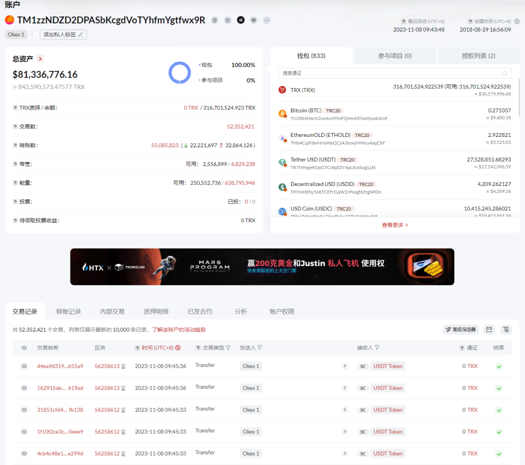 从中我们可以看到该地址的实时交易,也包括账户结余、持有代币、发行的合约等等,我们可以根据自己的需要取用对应的模块,这对于交易量较小的账户已经足够了,但是对于交易量过大的,可能需要一些额外的分析工具,例如OKLink、Tronscan分析功能等。