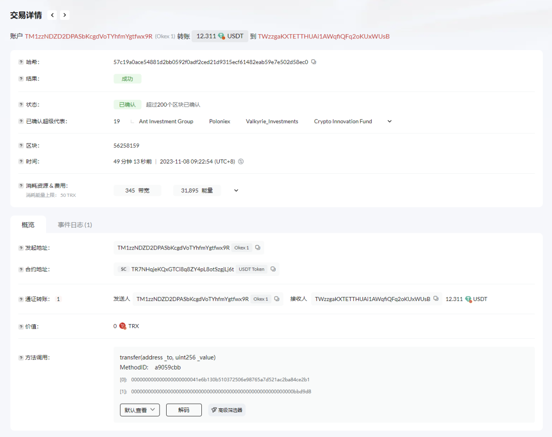 transfer方法在这里只使用了两个值,_to和_value,_to 为一个address属性的参数,可以看到Tron网络中特有的41开头长度为21 Bytes的地址,将它进行base58编码之后就是我们常见的地址,同时浏览器的通证转账也帮我们解析了这一个值,那么另外一个_value就是这个和代币转移量了,其为一个int,根据合约规定的粒度来决定它具体转账量,还是以这个交易中的0xbbd9d8为例,将它转为10进制,并按照合约中规定 TRC20-USDT 的粒度为6,即该笔交易转移的 TRC20-USDT 的交易量为12.311000。