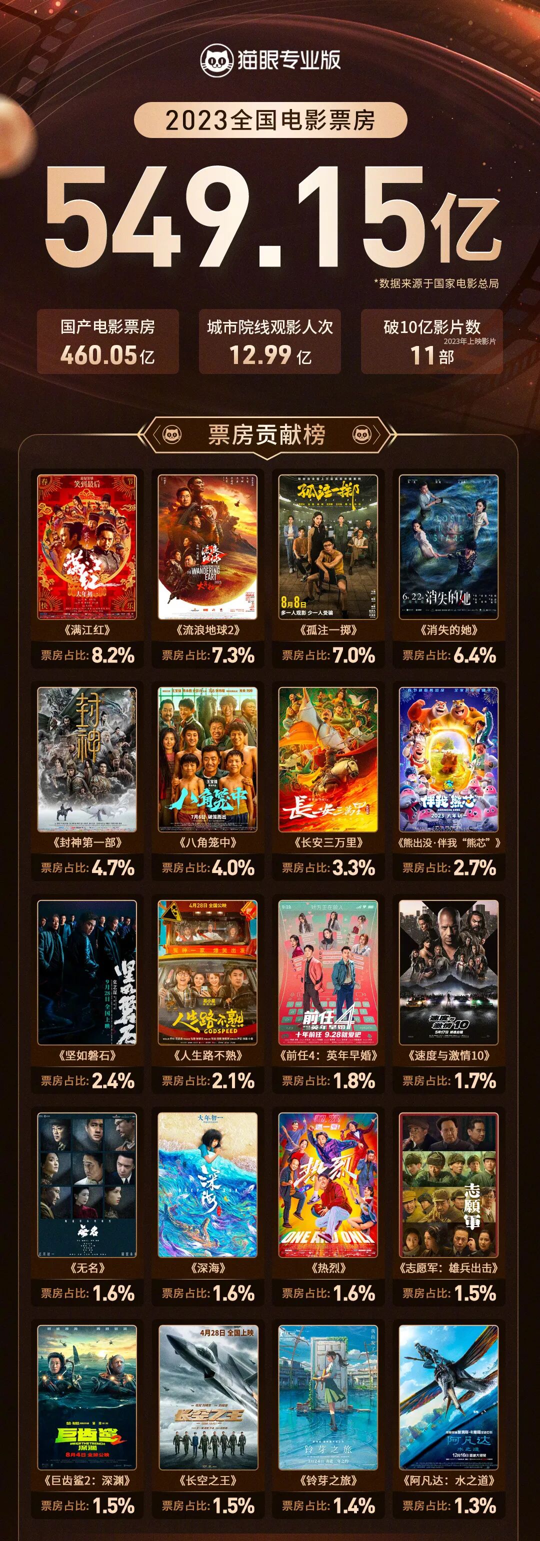 据国家电影局统计数据显示,2023 年全国电影票房 549.15 亿元。国产电影票房 460.05 亿元,占比为 83.77%,城市院线观影人次为 12.99 亿,全年票房过亿元影片共 73 部,其中国产影片 50 部。电影《野孩子》发布元旦贺图