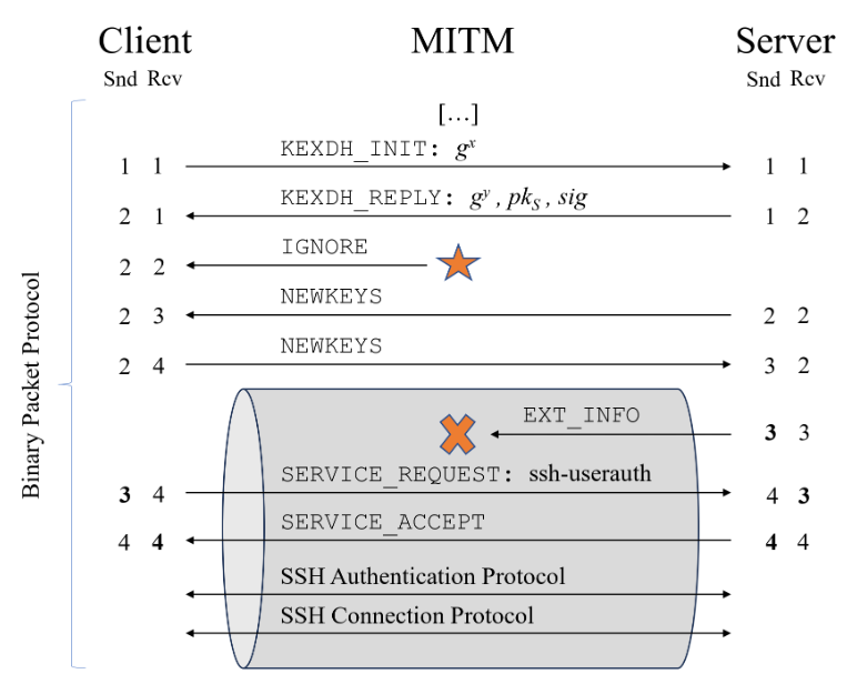 Terrapin攻击流程如图所示,攻击者丢弃一个用于协商多个协议扩展的EXT_INFO消息。一般来说,客户端在接收到服务器发送的下一个二进制包之后会检测到包删除,因为序列化会不匹配。为预防该问题,攻击者在握手阶段注入一个可忽略的包来使序列化产生对应的偏移。