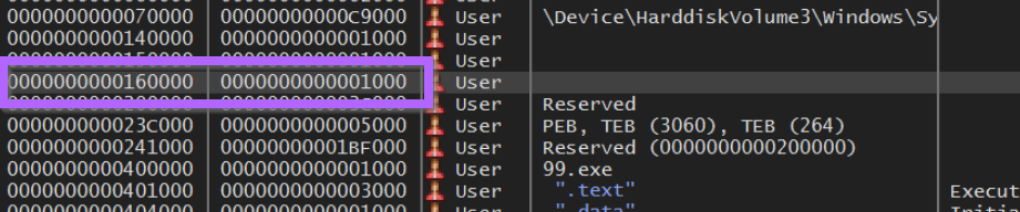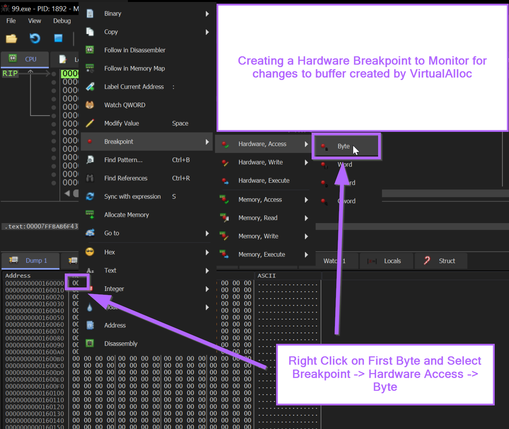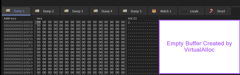 VirtualAlloc已经创建了一个空缓冲区,现在,我们可以通过创建一个硬件断点来监控这个缓冲区的变化。