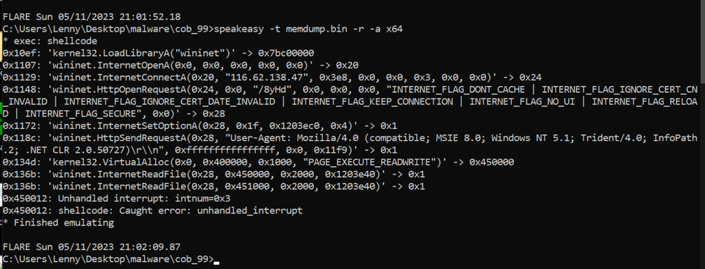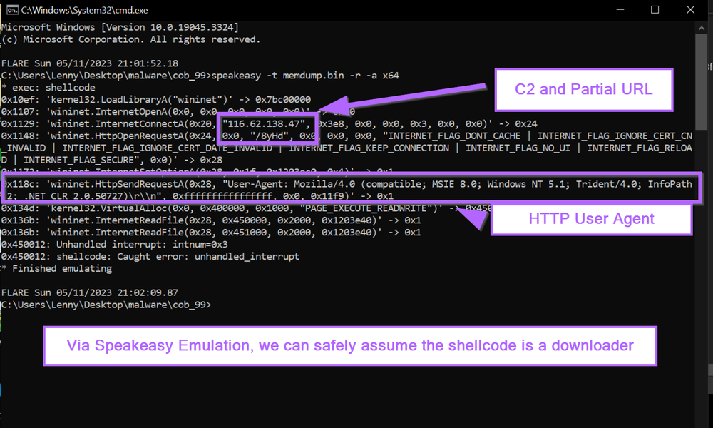由于非常怀疑缓冲区包含shellcode,所以我们可以继续使用Speakeasy来模拟它。