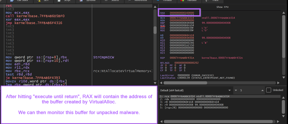 我们的主要目的是获取由VirtualAlloc创建的缓冲区,我们可以通过使用Execute Until Return来实现这一点。“Execute Until Return”将允许VirtualAlloc函数完成,但不允许发生任何进一步的操作。这意味着我们可以很容易地获得创建的缓冲区的地址。