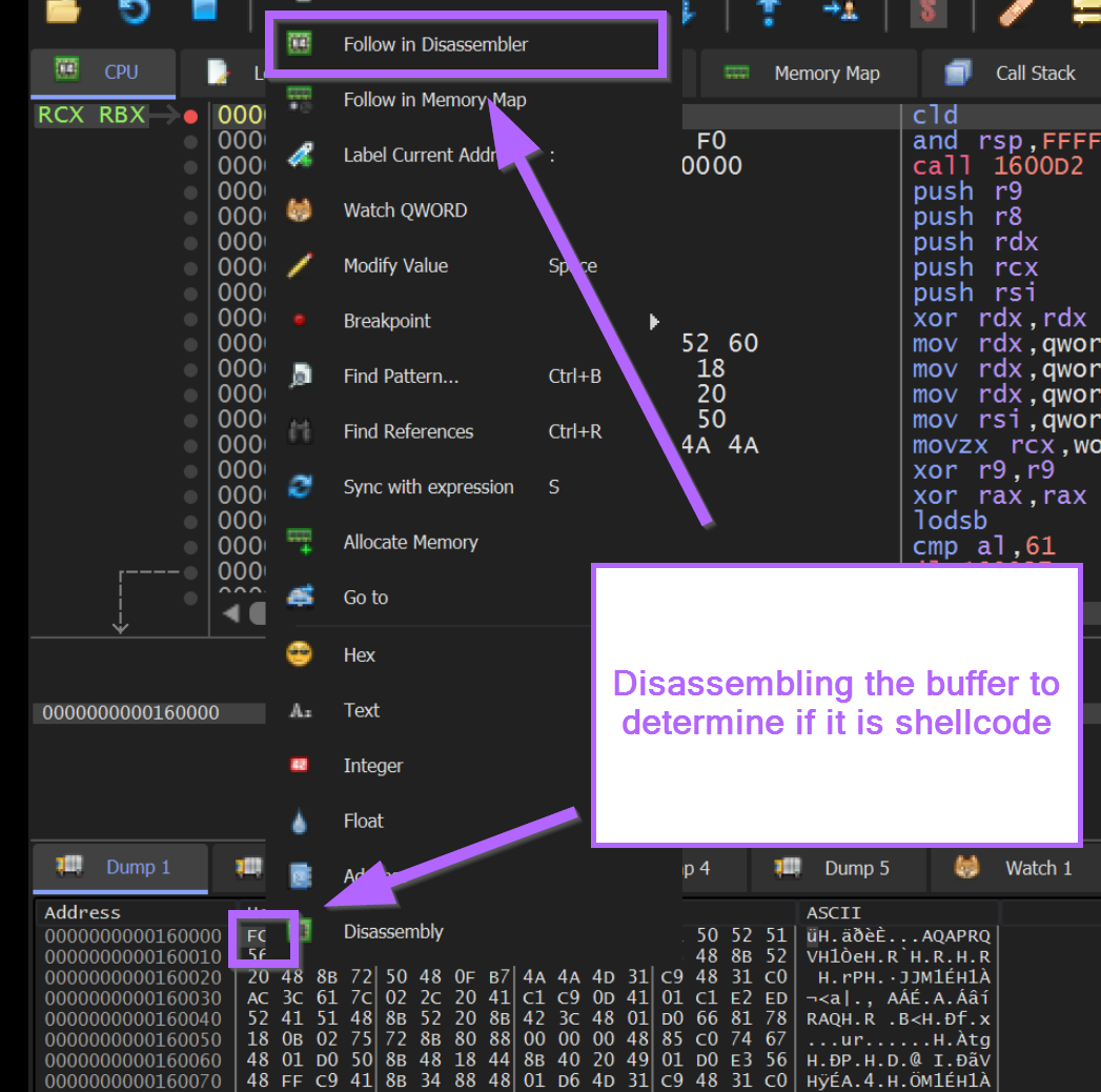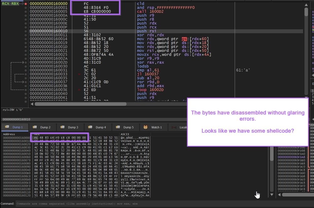 现在我们有了一个合理的假设,即缓冲区包含shellcode,我们可以继续尝试使用X64dbg对其进行反汇编。如果我们反汇编代码并且没有明显的错误,那么很有可能正在查看shellcode。